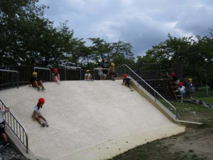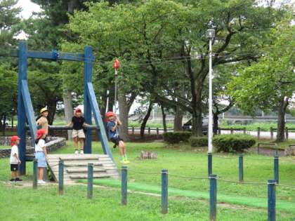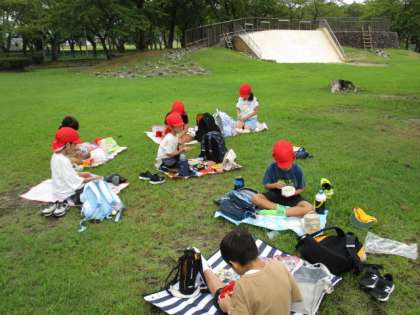 お楽しみのお弁当タイム。食べたら疲れが吹き飛び、元気に遊べました。松ぼっくりやドングリを拾って楽しむ姿もありました。