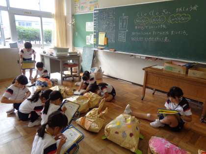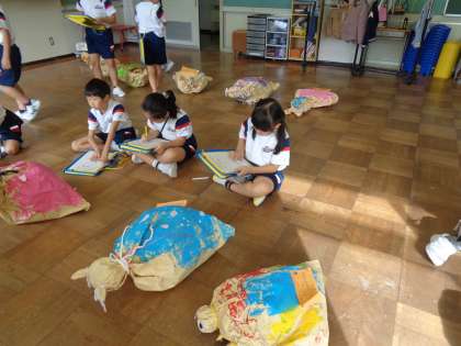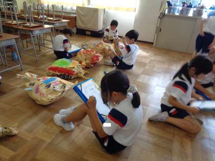 今日の図工は、「くしゃくしゃ ぎゅっ」の作品鑑賞会をしました。友達の作品のすてきなところ、すごいところを目と心で鑑賞しました。