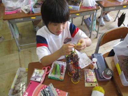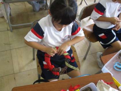 あさがおのつるを使ってリースを作っています。子供たちはモールやリボンを巻き付けたり、飾りを付けたりしています。どんなリースに仕上がるか楽しみです。