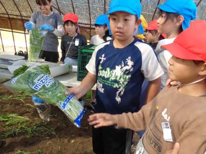 ビニルハウスの中では、採れたての水菜の袋詰め作業を見せていただきました。子供たちは、スーパーで並んでいる商品を、地元で間近に見ることがとても新鮮のようでした。
