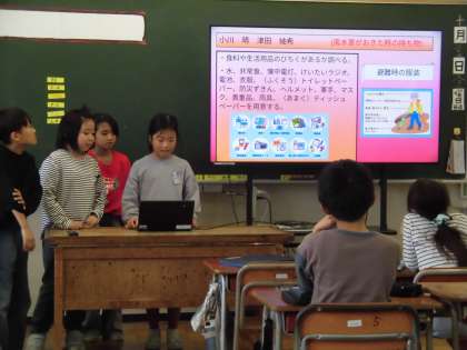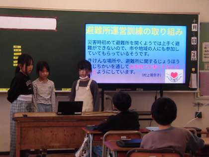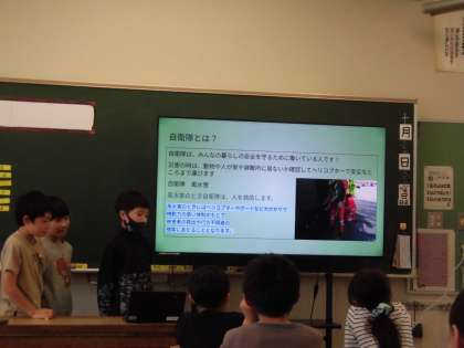 社会科では、風水害から暮らしを守る人々についてグループに分かれて発表しました。グループごとに分かりやすくまとめ、クイズを入れる等の工夫も見られました。