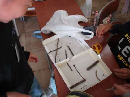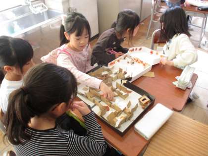 生活科「あきをたのしもう」では、ドングリや落ち葉、松ぼっくりなどの秋のものを使っておもちゃを作っています。どうしたら楽しいおもちゃになるかを遊びながら作っています。