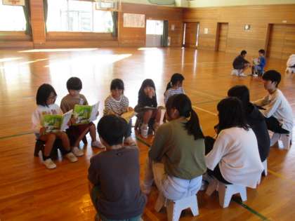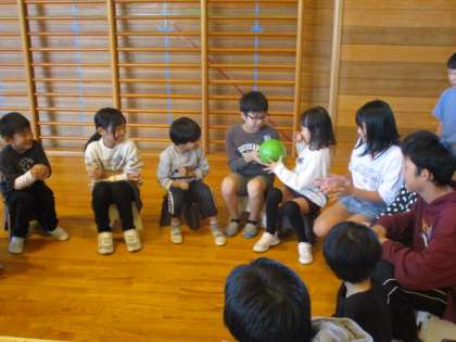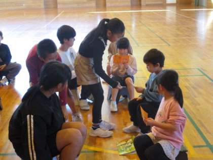 6年生さんが交流会を企画し、1年生を招待してくれました。一緒にダンスをしたり、ゲームを楽しんだりしました。1年生は「くじらぐも」の音読を聞いてもらいました。最後には一人一人を思って作ってくれたプレゼントをもらい、子供たちはとても喜んでいました。