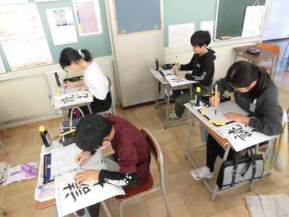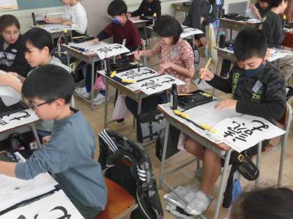 5年生の書写の学習では、「読む」という字を、漢字と仮名で大きさを変えて書くと全体のバランスが整うことを意識して書いています。この日はそのほかにも、始筆や終筆、字形を整えるポイントなど自分で決めた課題を達成できるように書きました。どの子もレベルアップした字に仕上がりました。