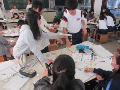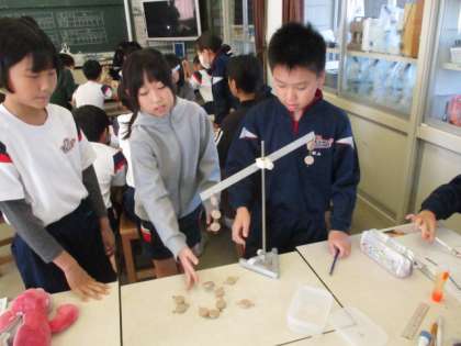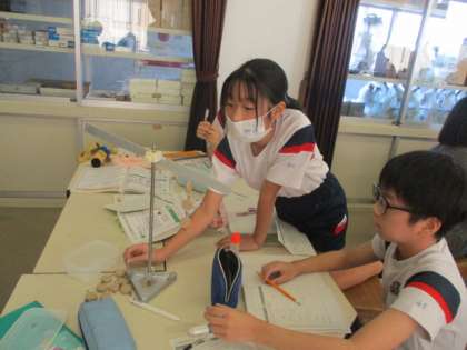 理科では、てこのはたらきを学習しています。今日は、実験器具を使って水平につり合うきまりを調べました。実験をしている中で「あれ?これ反比例していない?」と算数科で学習したことと結びつけて発言している子どもがいました。すばらしい!