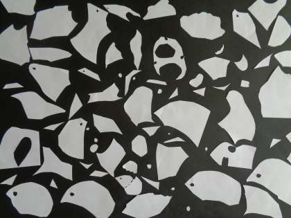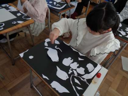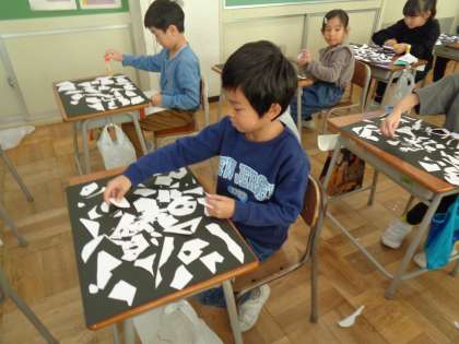 図工で取り組んでいた「はさみのあーと」が完成しました。ざくざく、すいすい切った紙から、すてきな絵ができました!