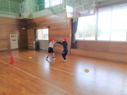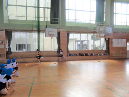 今日の体育は、明日のファミリーマラソンに向けて、たすきの受け渡しや、たすきのかけ方、そして自分のペースで走る練習をしました。