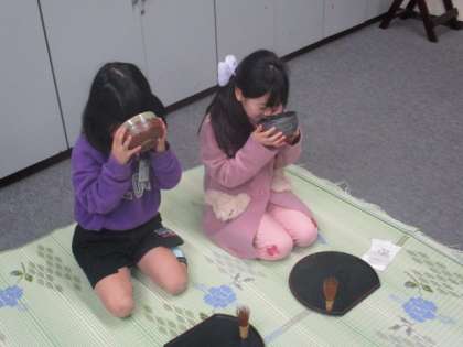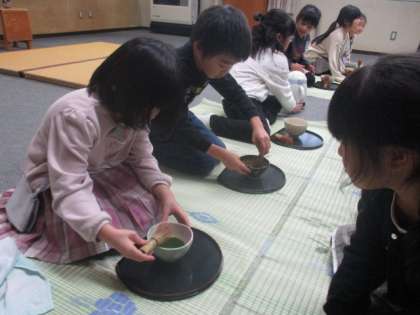 先生のお茶のお手前を見させていただいたり、自分でお茶を点てて友達に飲んでもらったりしました。お茶を飲むことがあまりない子供たちですが、どんな味なのかを試していました。