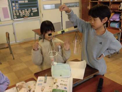 てんびんを使って、身近な物の重さを比べました。鉛筆や消しゴムなど様々なものをはかってみることで、手で持った時に感じる重さと結果との違いに驚いていました。