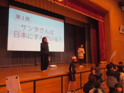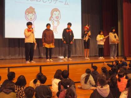 児童会活動 ファミリークリスマス集会 公開日 2024/12/13 更新日 2024/12/13 学校行事・児童会活動 運営委員会主催のファミリークリスマス集会を行いました。ミニゲームをファミリーで楽しんだり、クリスマスの歌を全校で歌ったりして楽しい時間を過ごすことができましたね。みんなの笑顔がたくさん見られる集会でした!