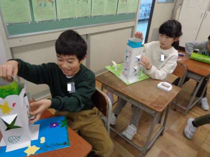 窓の中から、見える絵を描き、くるくる回るように工作用紙を丸めました。楽しい作品ができました!