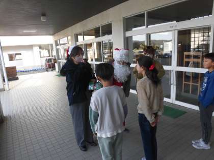 この日、5年生のところにサンタさん!?がやってきました・・・。実は、総合的な学習の時間で交流した「日和野」の方々がサンタやトナカイの格好で、子供たちプレゼントを作って持ってきてくださいました。子供たちは、突然の訪問に驚きながらも、頂いたプレゼントを嬉しそうに手にとっていました。少し早いクリスマスプレゼントになり、みんな温かい気持ちになりました。