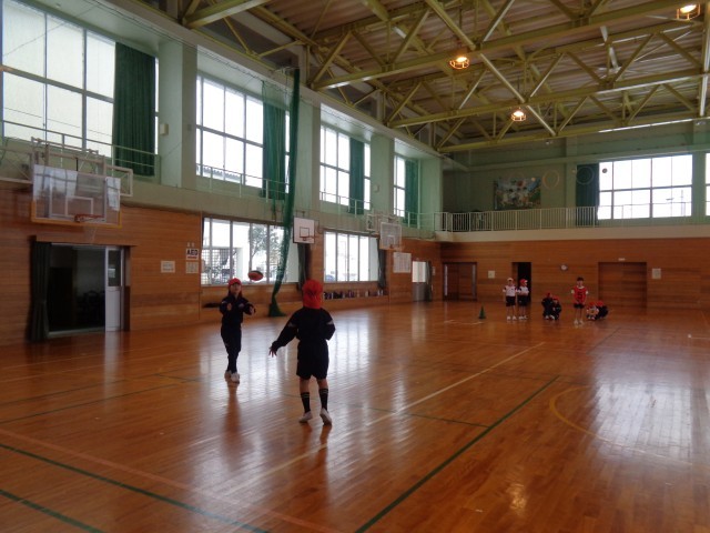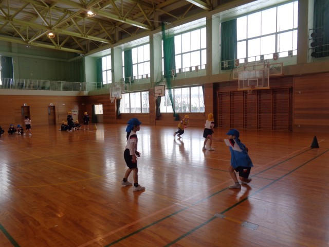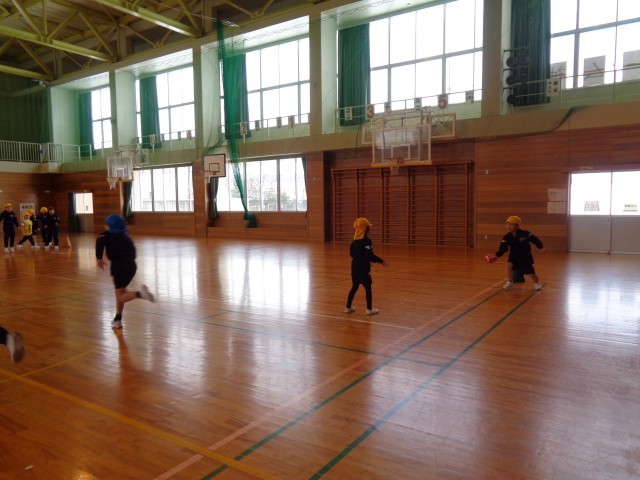2学期の終わりから、ミニラグビーボールでパス練習をしています。ラグビーボールは普通のボールと形状がちがうので、なかなか相手にうまく投げられない難しさがあります。またラグビーは、前にパスを出してはいけないので、受ける人より前に出て投げる練習をしました。上手になったので、今日はボールパスリレーをしました。