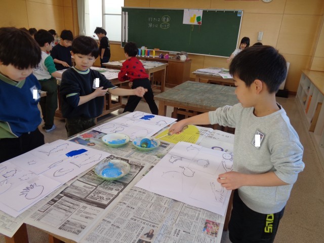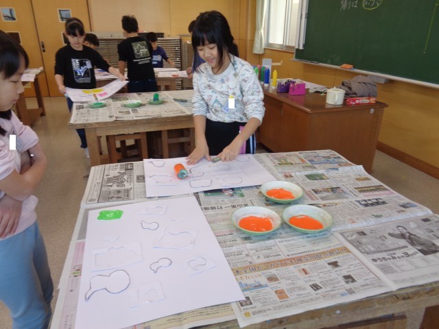 図工では、「たのしく うつして」の学習をしています。今日は出来上がった型紙に、インクをのせました。型紙をめくったらどんな形が出てくるのか、みんなわくわくしながら、取り組んでいました。