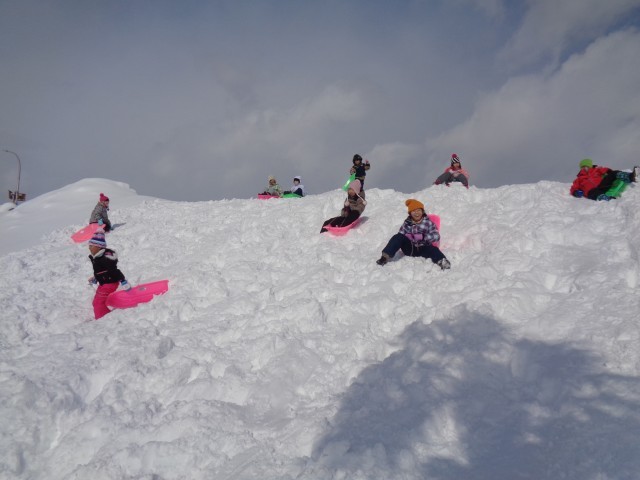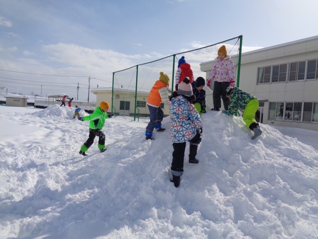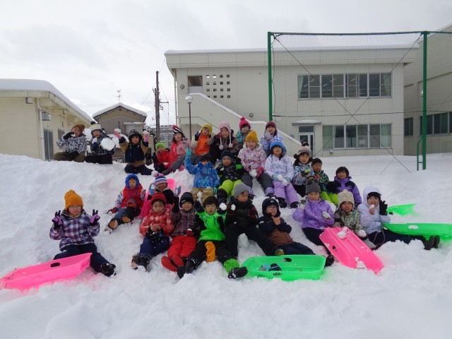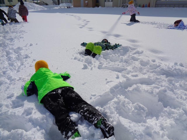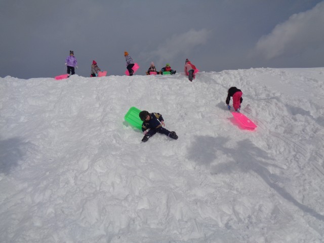 今日は、雪で遊びました。ふわふわの新雪で、歩くのもままならない中、そりをしたり、かまくらをつくったり、思う存分、雪とたわむれました。