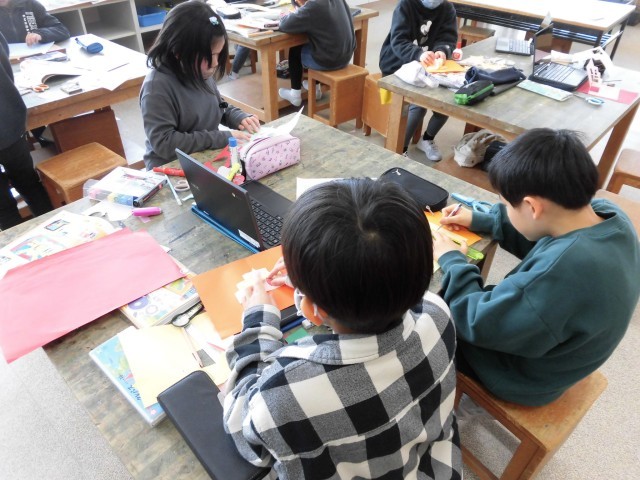 図画工作科では、「カードでつたえる気持ち」という学習をしています。飛び出す仕組みを工夫して考えていました。