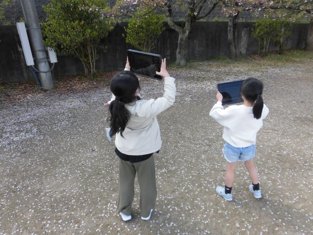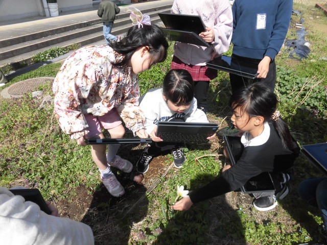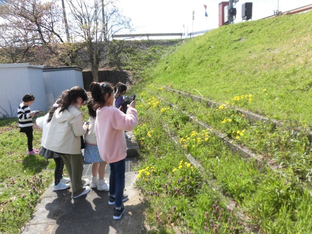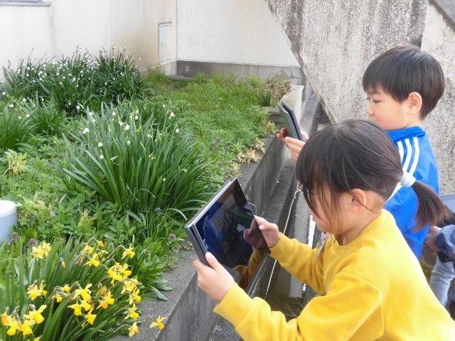 生活科の学習で、春みつけをしました。チューリップや水仙、地面いっぱいに落ちた桜の花びらなど、それぞれが春に関するものを見つけて、写真を撮りました。