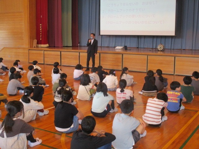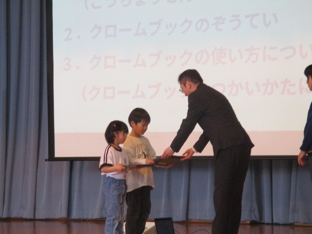 GIGA開きの式を行いました。1年生も校長先生からクロムブックを受け取りました。約束をしっかり守って、有効に活用していきましょうね。