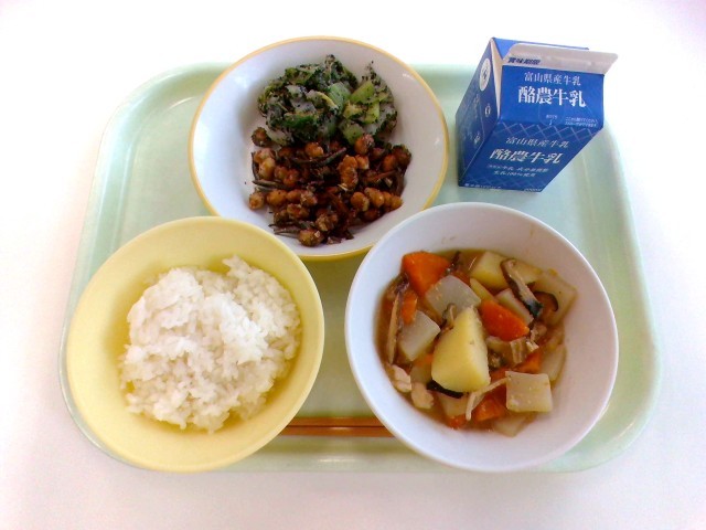 ご飯、牛乳、小魚入りフライビーンズ、よごし、南蛮煮