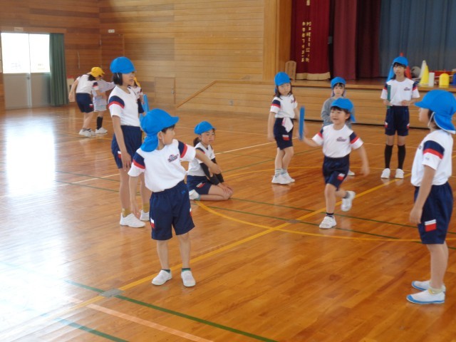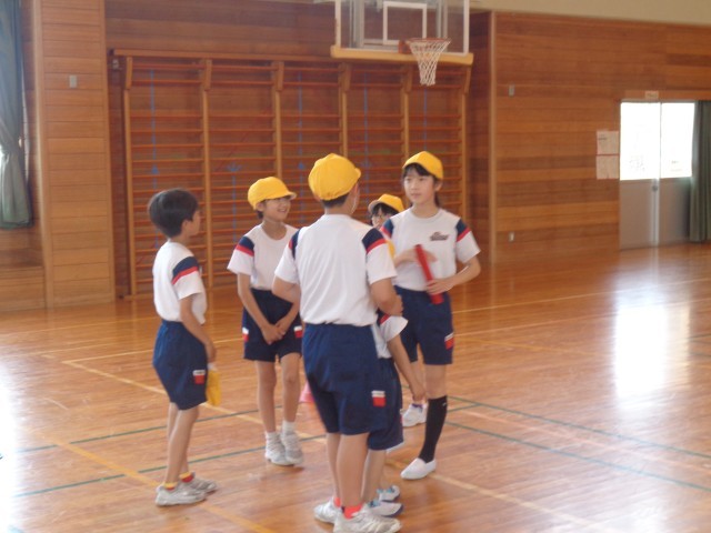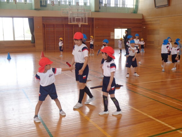 今回は上学年が中心となってバトンパスの仕方を教えていました。