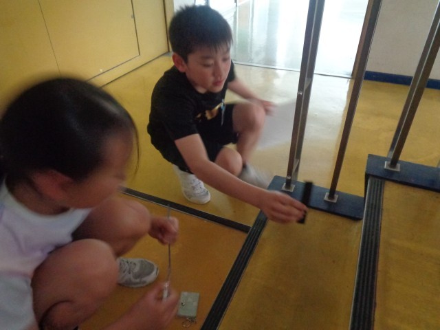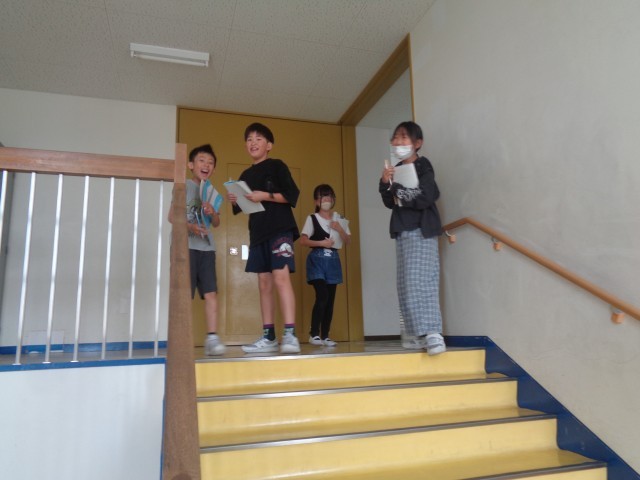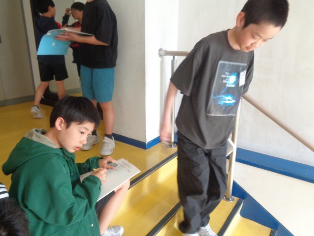 算数科では比例の学習をしています。今回は、階段の1段の高さや段数を調べ、比例の関係を使って学校の1階から3階までの高さを調べました。