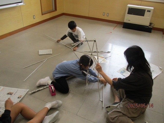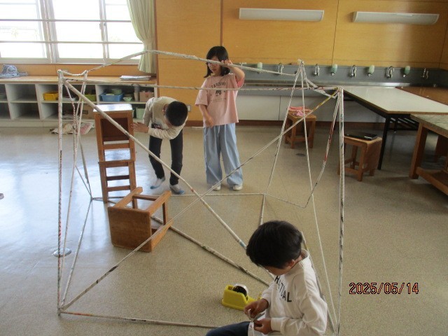 棒状にまるめた新聞紙をつなげて造形遊びをしました。子供たちは、グループで話し合い、楽しみながら活動しました。