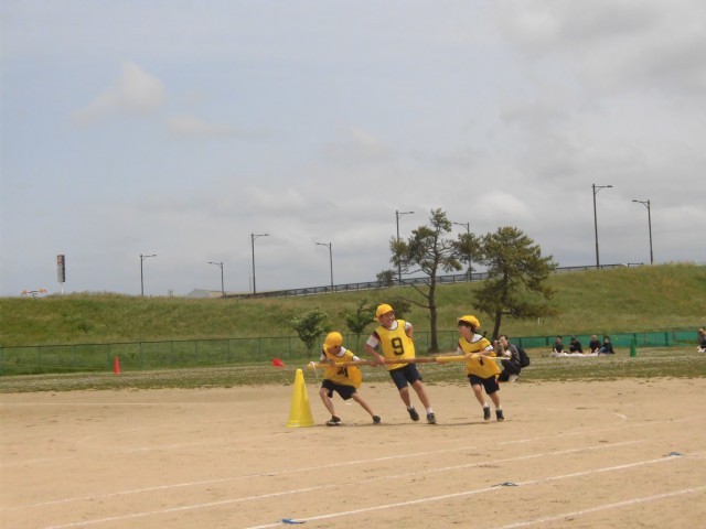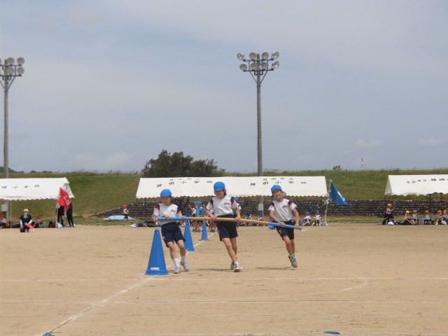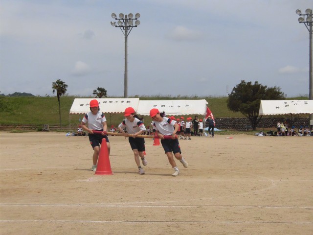 中学年の団体競技「神明タイフーン」の様子です。1位を目指して声をかけ合ったり、応援したりしていて素敵でした。