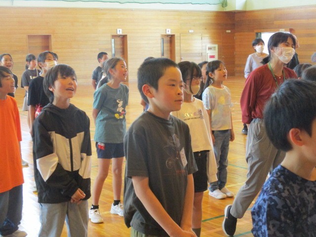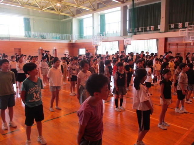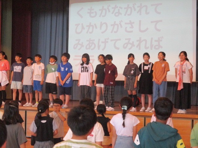 今日は歌声タイムに「にじ」を全校で歌いました。6年生がステージで見本となってくれました。