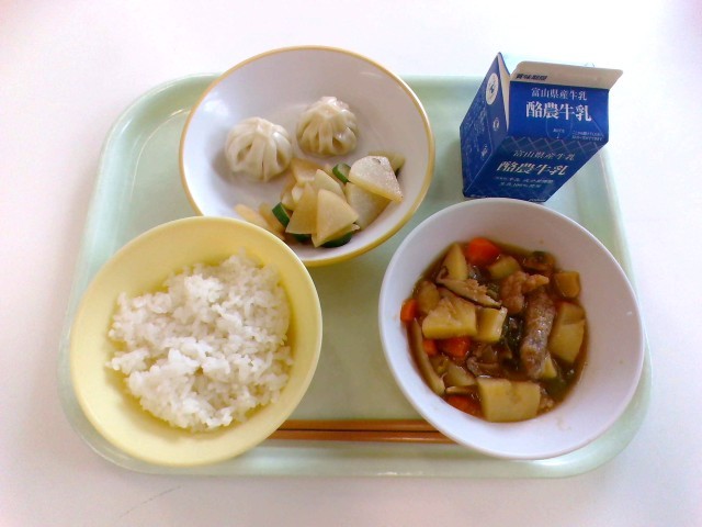 今日の給食は、中華献立でした。酢豚に入れる豚肉やじゃがいもを揚げ始めると、給食室からいいにおいがただよってきました。