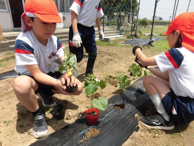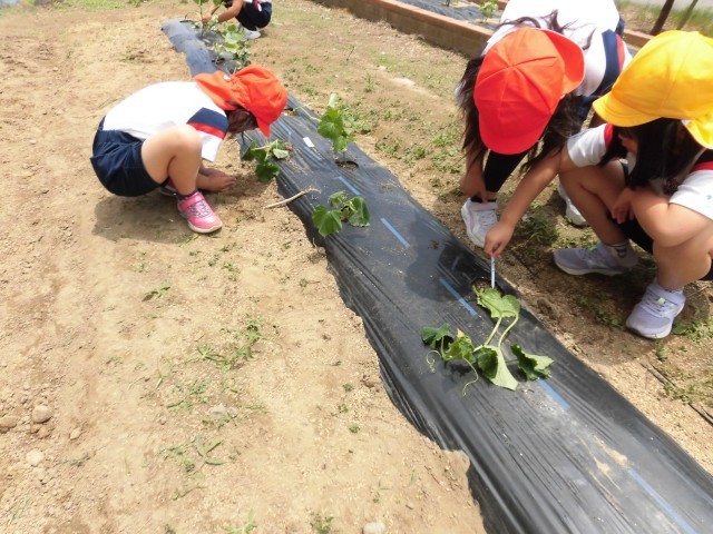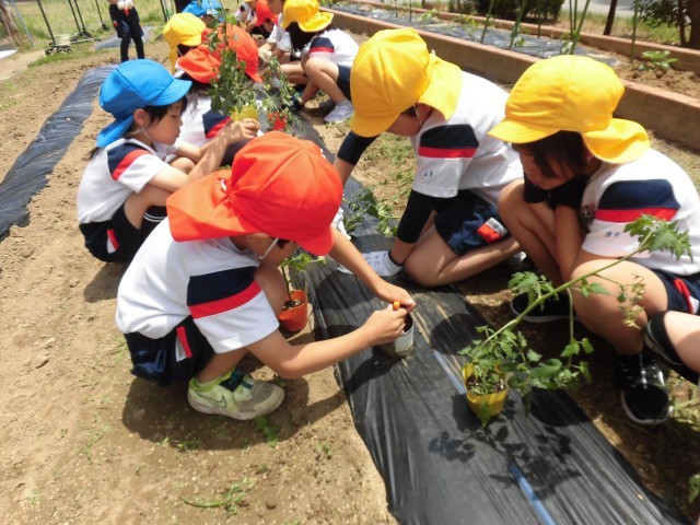 先日購入した野菜の苗を植えました。「背の高い苗がどうしても倒れてしまうけど、どうしよう。」という子に対して、「お家では、支柱立ててたよ。」という子のアドバイスを基に、トマトやきゅうりなどの苗には、支柱立てをしました。これから毎日水やりをしながら、野菜の成長をみんなで見ていきたいと思います。