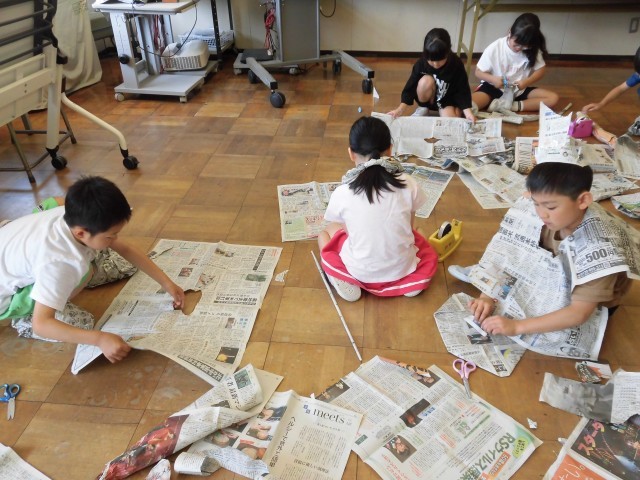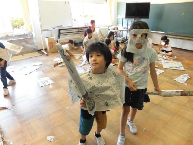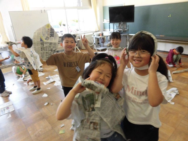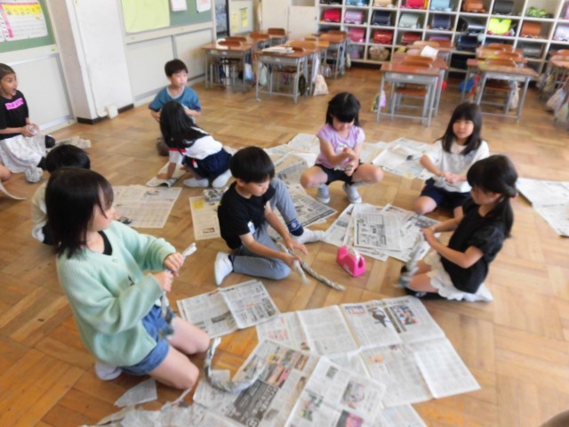 図工科の学習で、新聞紙を丸めたり破ったりして、思い思いに作品を作りました。丸く破って洋服を作ったり、細長く丸めてステッキを作ったりなど、オリジナルの作品が完成しました。