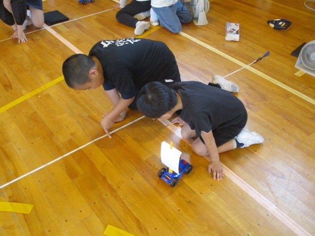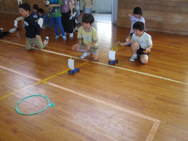 理科「風のはたらき」では、風の強さによって車がどれだけ動くのかを調べました。グループの友達と協力しながら、記録をとることができました。