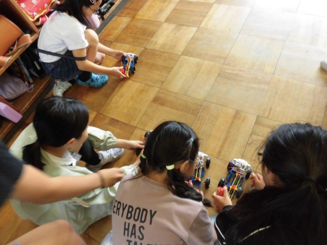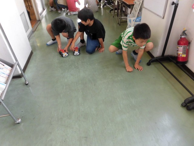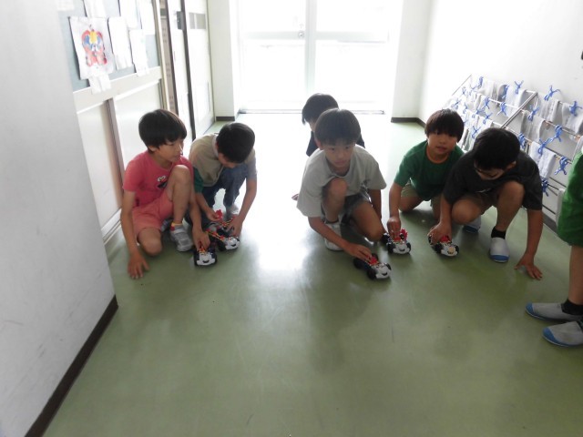 今日は、電流のはたらきのまとめとしてモーターカーを作って走らせました。説明書を見て試行錯誤しながら作る子、グループの友達と協力しながら楽しそうに車を作る子、いち早く作り上げ、ミニ先生になり友達に教えたり、先生の車も作ったりしている子・・・みんなそれぞれとても一生懸命でした。モーターカーを作った後は、「競走しよう。」「逆走しちゃった、どうしよう。」と言いながら、教室や廊下で車を走らせ、楽しみながら電流の働きを学ぶことができました。