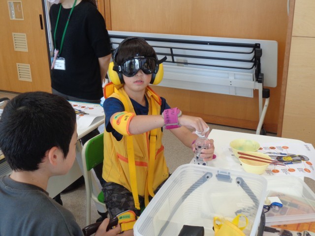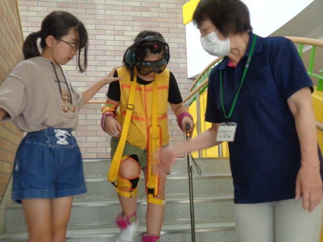高齢になると起こる体の変化を知った後で、キットを用いて高齢者の体の動きを体験しました。階段を上り下りしたり、ペットボトルのふたを開けたりする際に、思うように体が動かないことを実感していました。