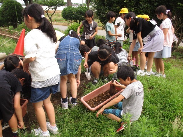 理科「植物の育て方」で育てているホウセンカなどをプランターに植え替えました。ヒマワリとピーマンは週末の暑さで葉が枯れてしまいましたが、水やりを続けて元気になってほしいです。