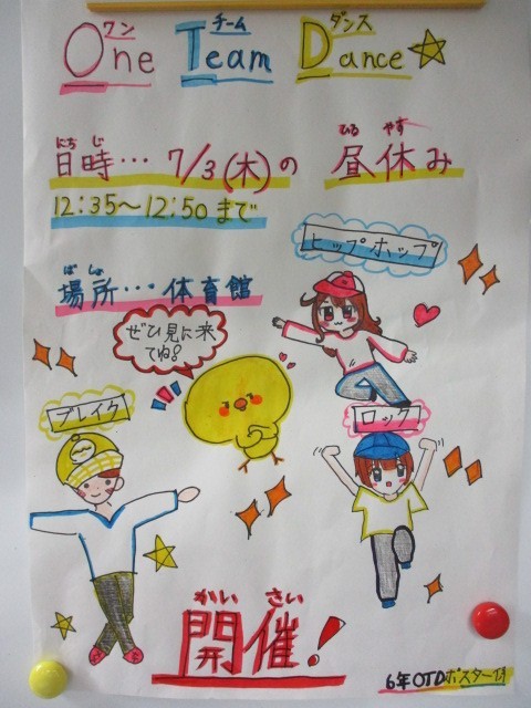 6年生はOTDP(One Team Dance Project)を進めています。体育科で学習したダンスを全校に発表するゲリラライブの準備を進めています。体育館のアポイント取りやポスター掲示の許可とりなど、企画力を育てています!