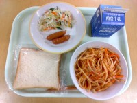11月19日(水)の給食ソフト麺のとやまの五目あん、牛乳、さつまいものきなこと桑...
