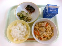 10月23日(木)の給食ごはん、牛乳、さばのみそ煮、炒り大豆和え、卵とじ 給食で...