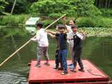 池遊びでは、班ごとにいかだに乗りました。ターザンロープにも挑戦しました。