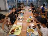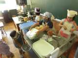 当番の子供たちが、素早くエプロンと三角巾を身につけ、お皿等の準備をしています。...