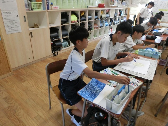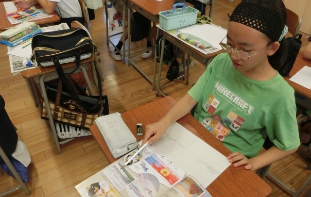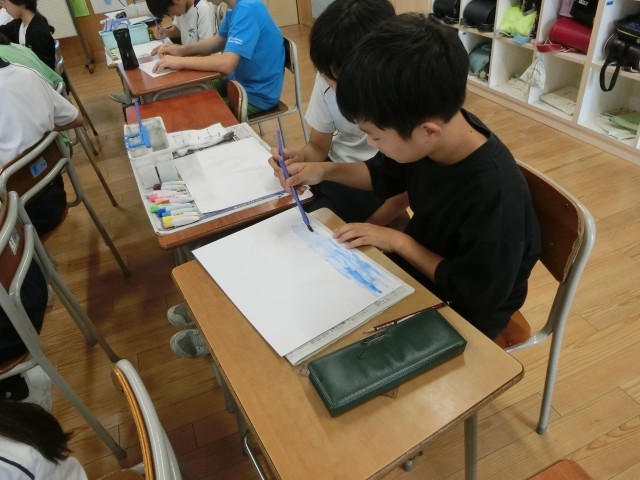 図画工作の授業で「わたしの空」を描いています。一人ひとり、自分だけの空を想像しながら描き始めています。