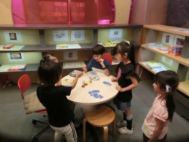 こどもみらい館での様子です。ふかふかな椅子に座ってゆっくり仲間とお話したり、カードゲームで遊んだりしています。