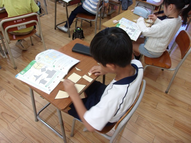 教科書に載っている「魚」や「船」の形だけでなく、「ロボット」や「飛行機」の形をつくるなど、図形同士の組み合わせを考えながら、様々な形をつくりました。