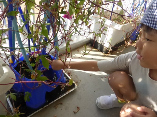 朝だけでなく、昼にも、夕方にも咲いている、不思議な「ぼくのアサガオ」です。