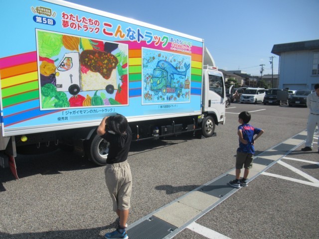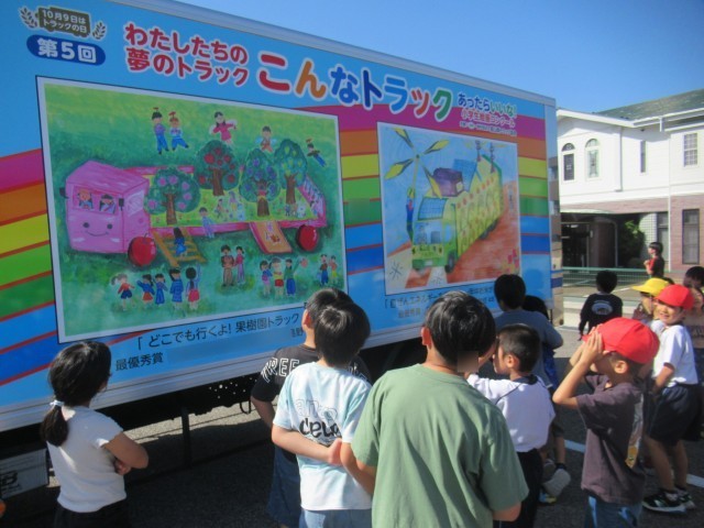 わたしたちの夢のトラック「こんなトラックあったらいいな!」お披露目 公開日 2025/10/22 更新日 2025/10/20 職員室 「わたしたちの夢のトラック『こんなトラックあったらいいな!』で受賞した作品がラッピングされたトラックが本校にお披露目にやってきました。夏休みの作品応募で、頑張って仕上げた仲間の作品が大きく掲示されているのを見て、「すごいなぁ」「来年は、描いてみようかな」とつぶやく子どもたちです。また、トラック協会様のご厚意で、トラックの運転席や助手席に乗せてもらったり、トラックの荷台を開けて見せてもらったりと、子どもたちは興味津々で見学していました。