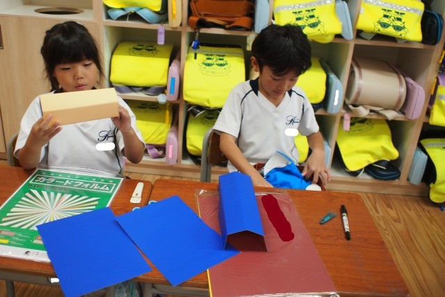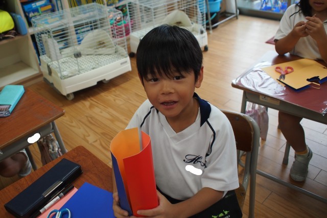 図画工作科「おってたてたら」の学習をしています。厚紙を折って立てると、何かに見えてきたようです。子どもたちに話を聞くと、窓や中にいる人を描くことで、「おってたてたら」の町を作ろうとしていると話していました。どんな町が出来上がるのか、楽しみです。