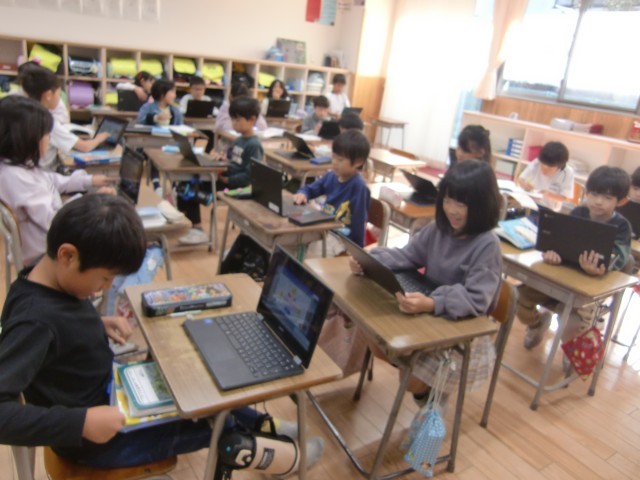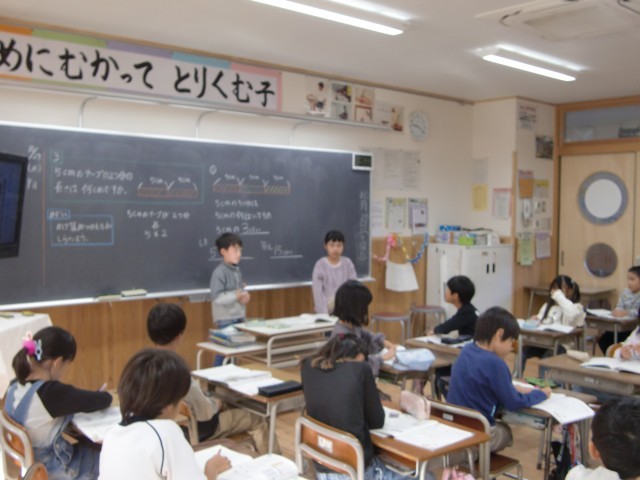 5cmのテープの2つ分や3つ分は何cmになるか。かけ算をつかい長さを求めました。また、「5cmの2つ分は2ばい。3つ分は3ばい」と、「ばい」という言葉を同時に学習しました。