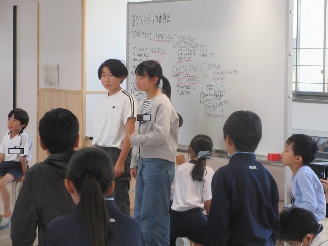 10月末に、くらしの委員会を行いました。参加者は、各学級の代表者と各委員会の委員長です。くらしづくり委員の進行のもと、運動会を終えたこれからのくらしづくりについて、それぞれの思いや考えを聞き合いました。くらしの委員会での話を各学級に持ち帰り、全校一人ひとりが自分の目当てをもってくらしをつくっていきたいと思います。