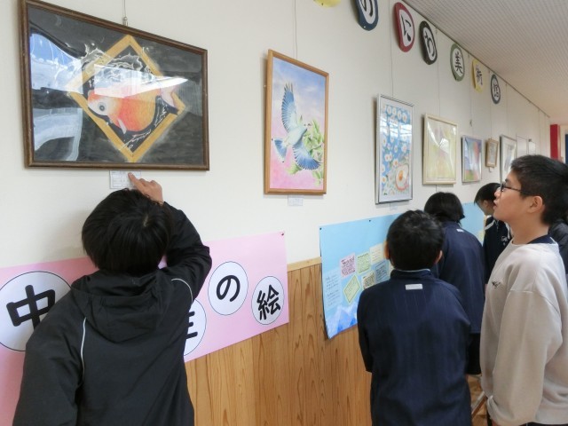 中学校の生徒が描いた作品を鑑賞しました。子どもたちは「発想が豊かでびっくり」「グラデーションがきれい」などと仲間と語りながらじっくりと観察していました。素敵な作品を見ることができて嬉しそうでした。