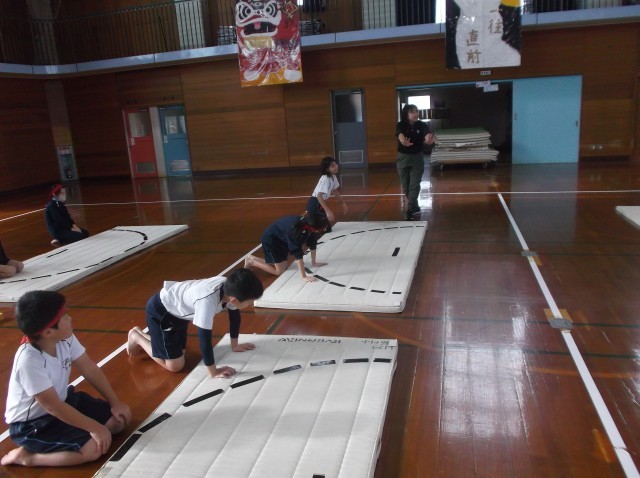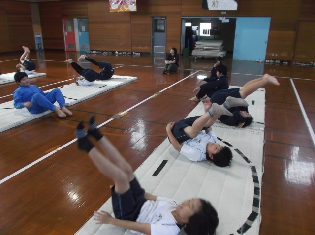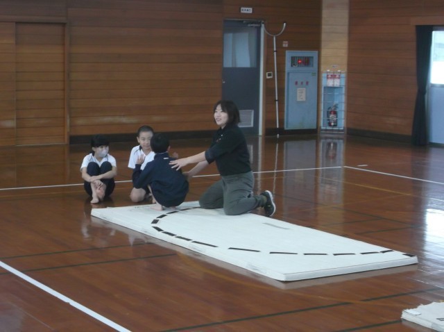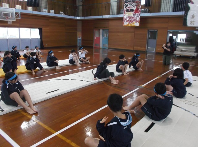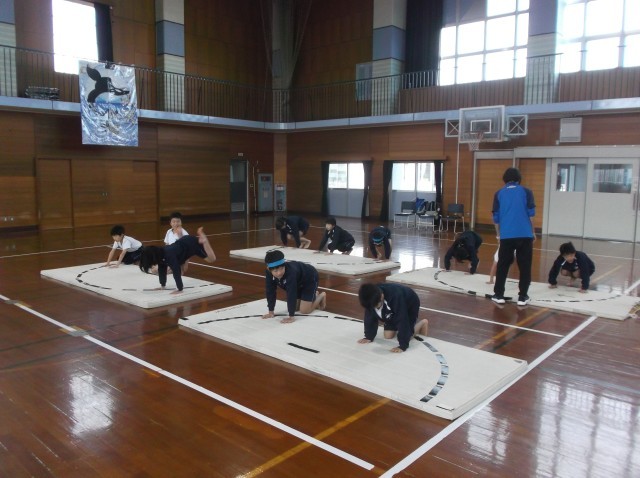 富山市スポーツ協会のスポーツ指導委員の方をお招きし、マット運動の出前講座を行いました。前転や後転、側転などのポイントを教えていただきながら、技能の向上を目指しました。